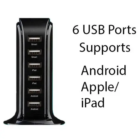SmartPower Tower for Smart Desk that will deliver 6 USB ports and sits on your desktop and plugs directly into a power outlet. The Smart Power Tower has a built-in hi-tech chip that will determine how much power is needed when you plug in your gadget or Smartphone and deliver that many watts of power by creating an exclusive deliverytunnel that will speedily charge your device.