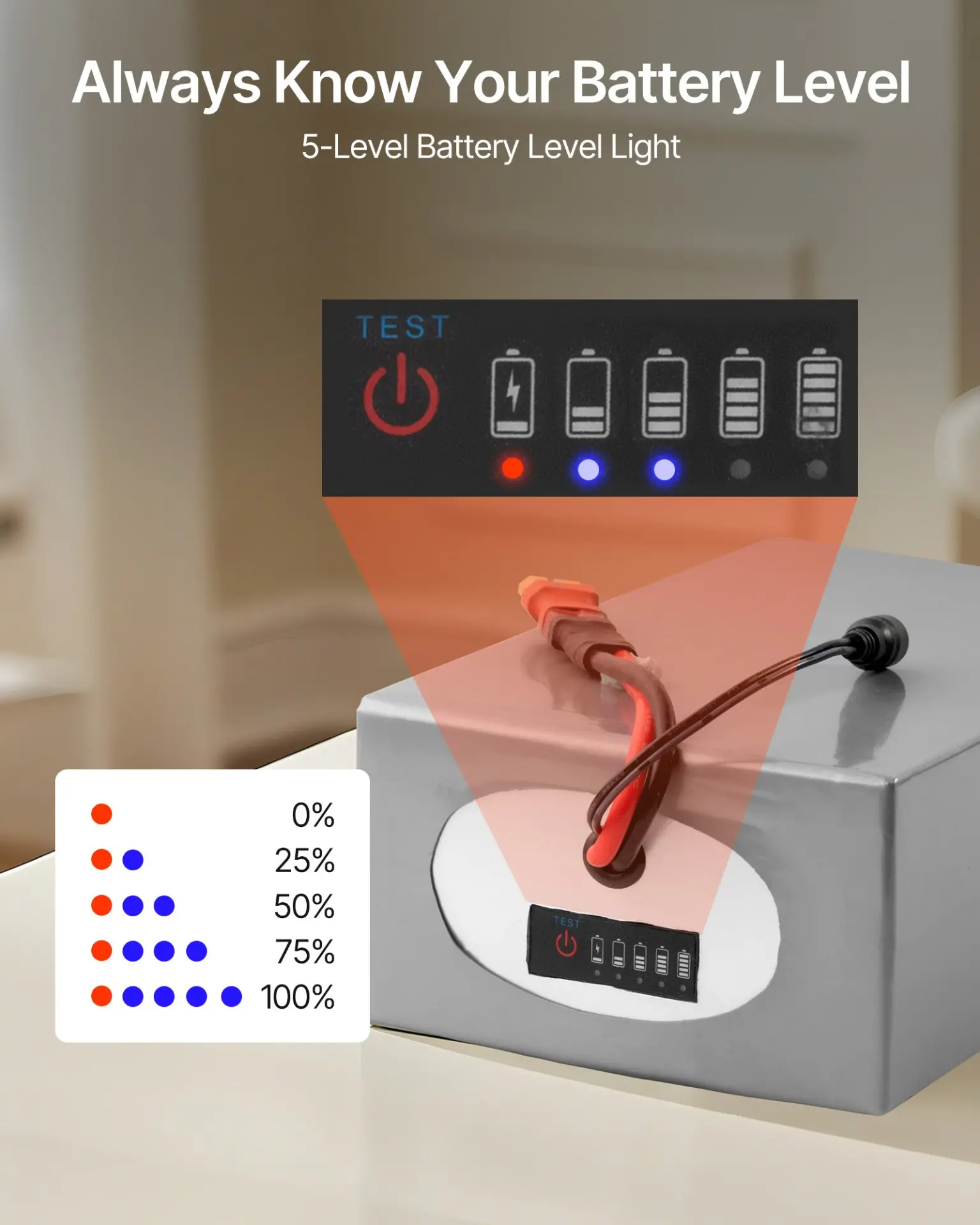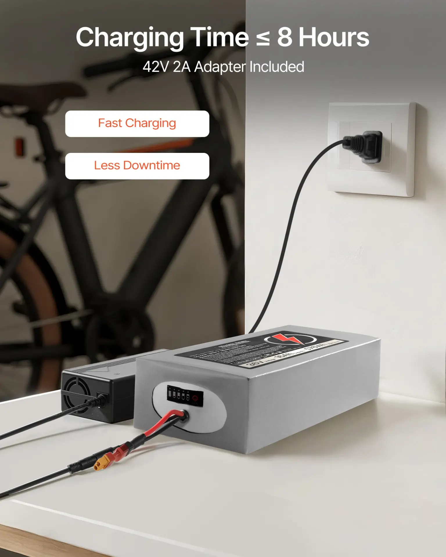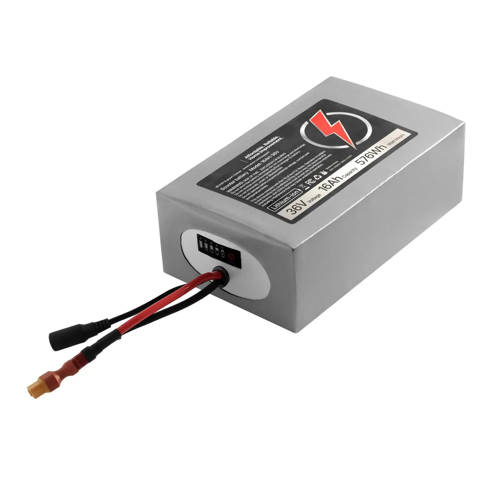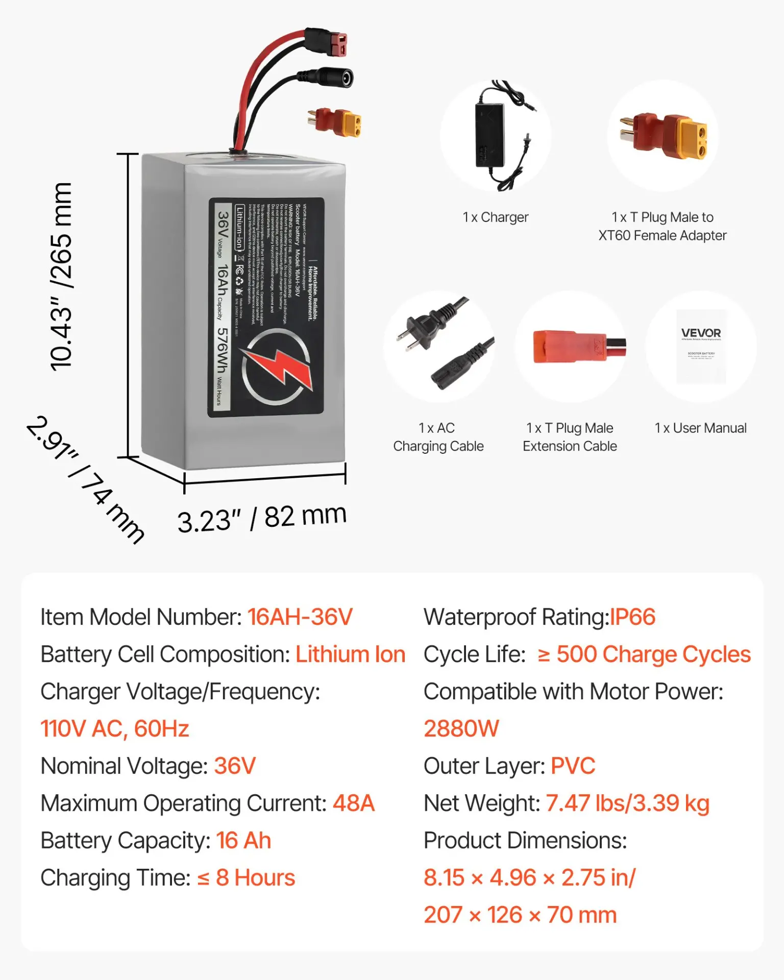 Charger Voltage/Frequency: 110V AC, 60Hz,Cycle Life: 500 Charge Cycles,Maximum Operating Current: 48A,Battery Capacity: 16 Ah,Waterproof Rating: IP66,Outer Layer: PVC,Item Model Number: 16AH-36V,Nominal Voltage: 36V,Battery Cell Composition: Lithium Ion,Compatible with Motor Power: 2880W,Charging Time: 8 Hours