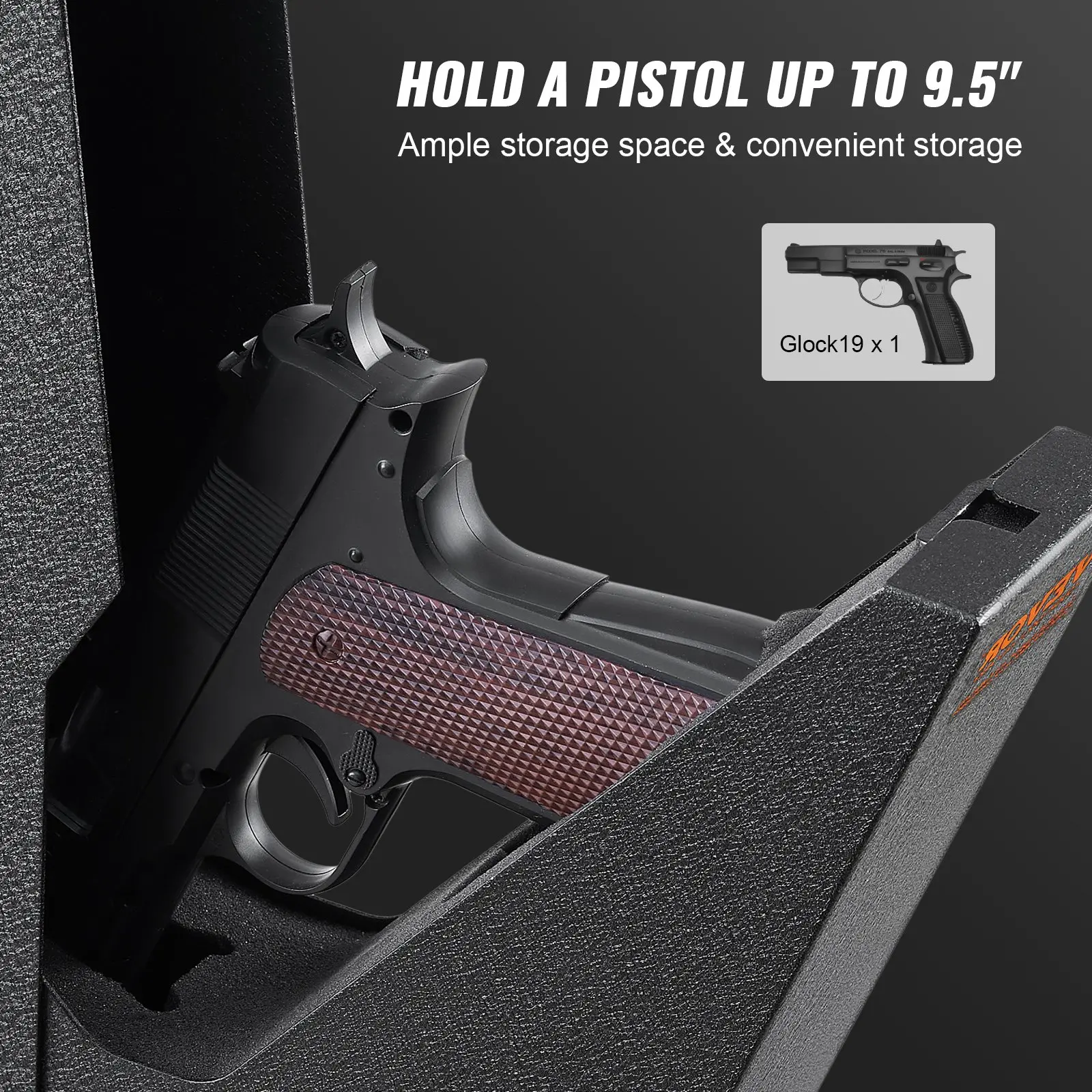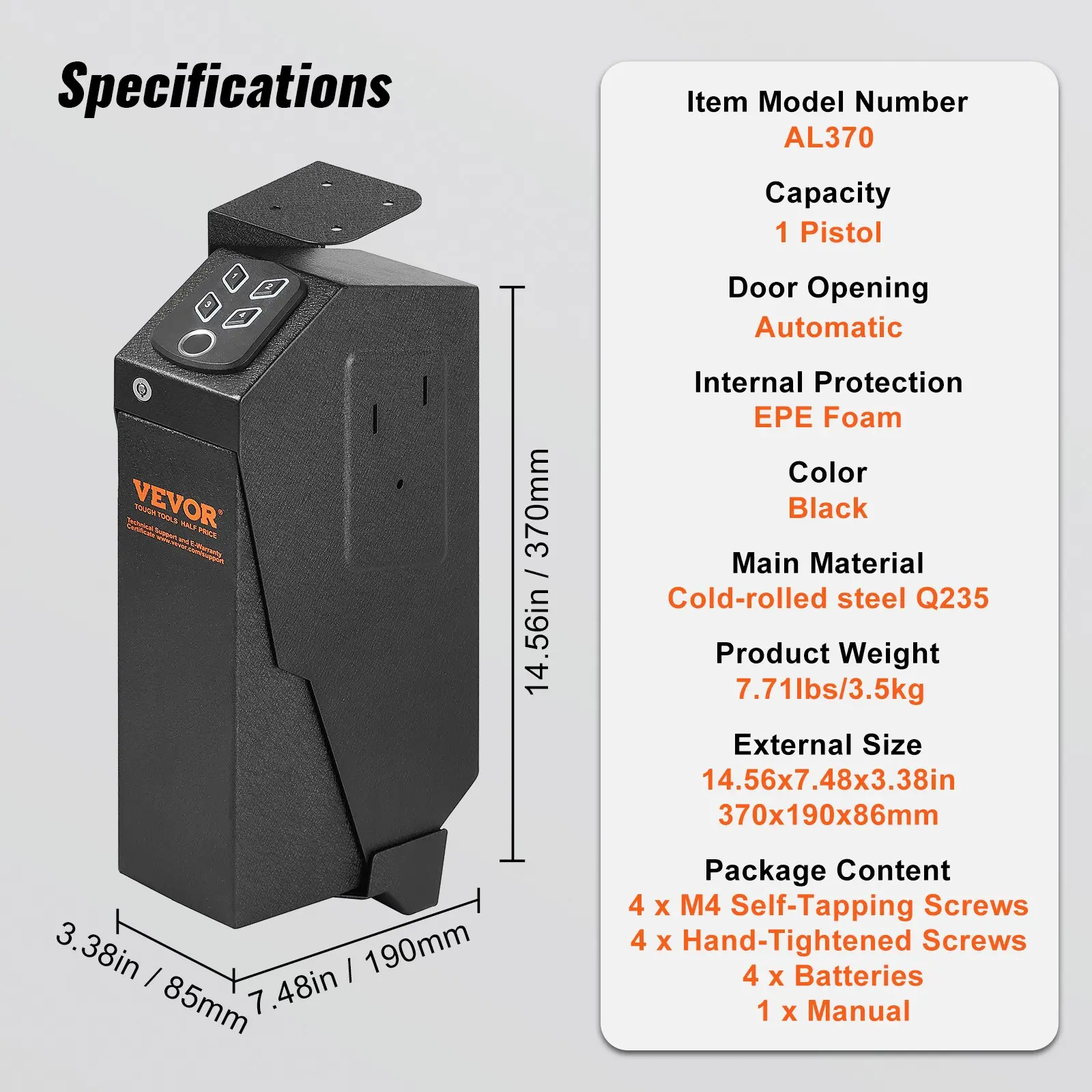 Internal Protection: EPE Foam,Capacity: 1 Pistol,Color: Black,Item Model Number: AL370,Door Opening: Automatic,Product Weight: 7.71lbs/3.5kg,External Size: 14.56×7.48×3.38in/370x190x86mm,Main Material: Cold-rolled Steel Q235